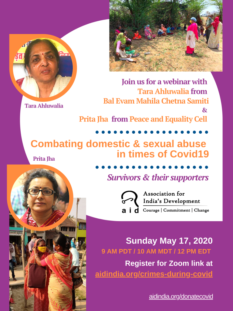 In May 2020, AID India hosted a webinar titled “Webinar on Combating Domestic & Sexual Abuse During COVID Times” to spotlight how the COVID-19 lockdown intensified risks for survivors of gender-based violence. The online event featured Prita Jha, Founder & President of Peace & Equality Cell (PEC), and Tara Ahluwalia, a seasoned social worker from Rajasthan, both of whom are advocates for action against gender crimes in India. The speakers shared ground-level insights into the distressing realities faced by survivors during lockdown, including heightened vulnerability due to confinement, limited access to support systems, and increased incidences of abuse — and also discussed ways civil society can help respond to these challenges.